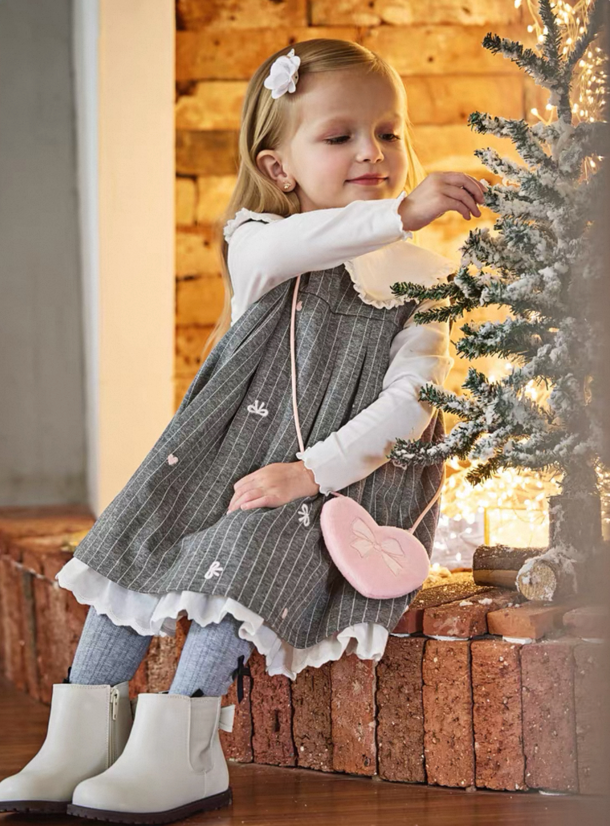 細かなストライプに、リボンやハートの刺繍が散りばめられたガーリーなワンピースです。