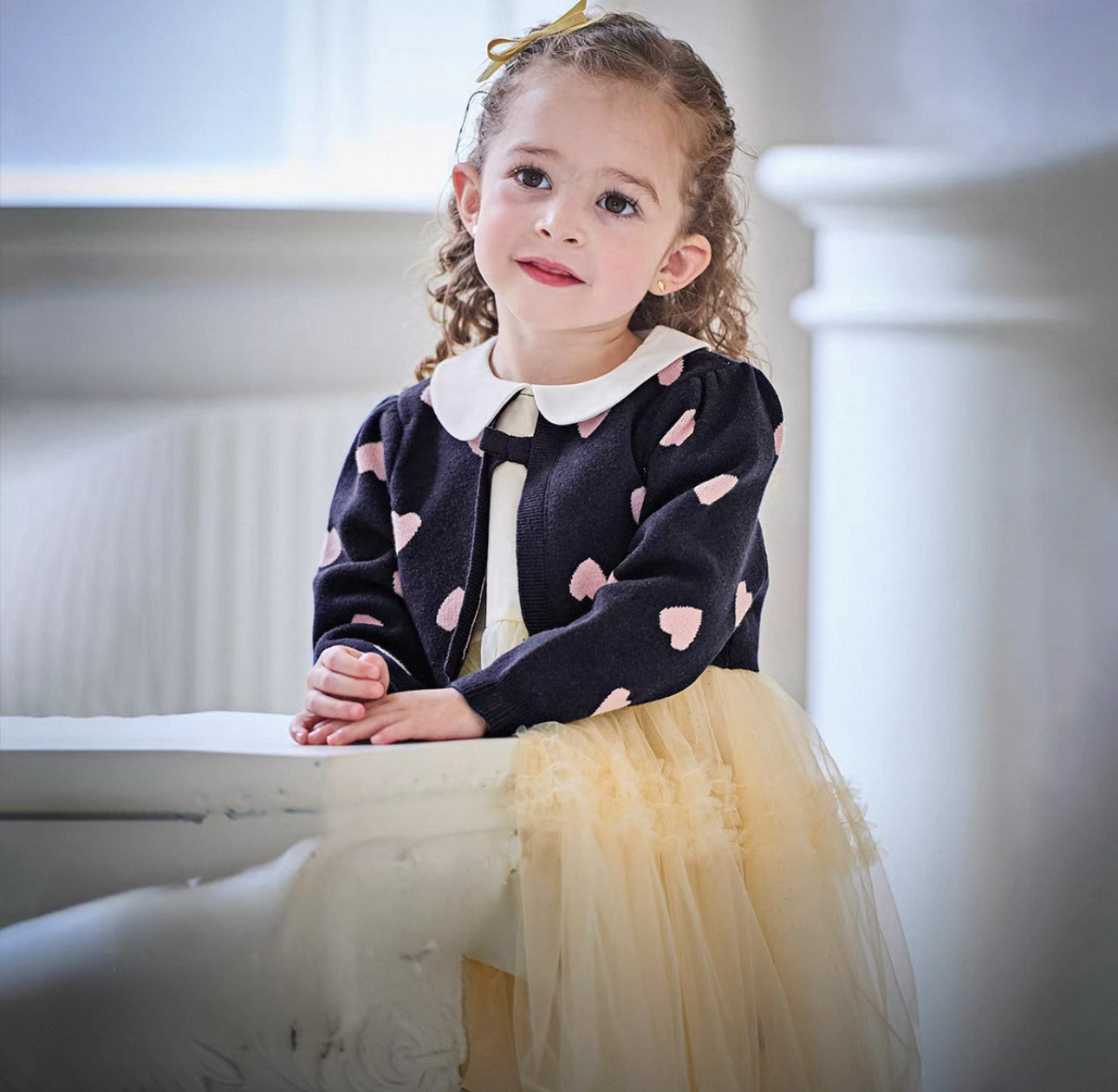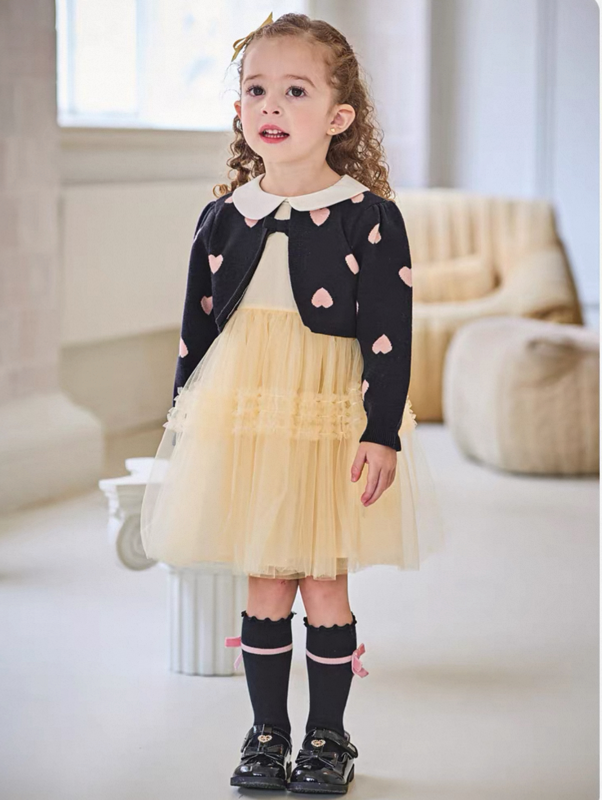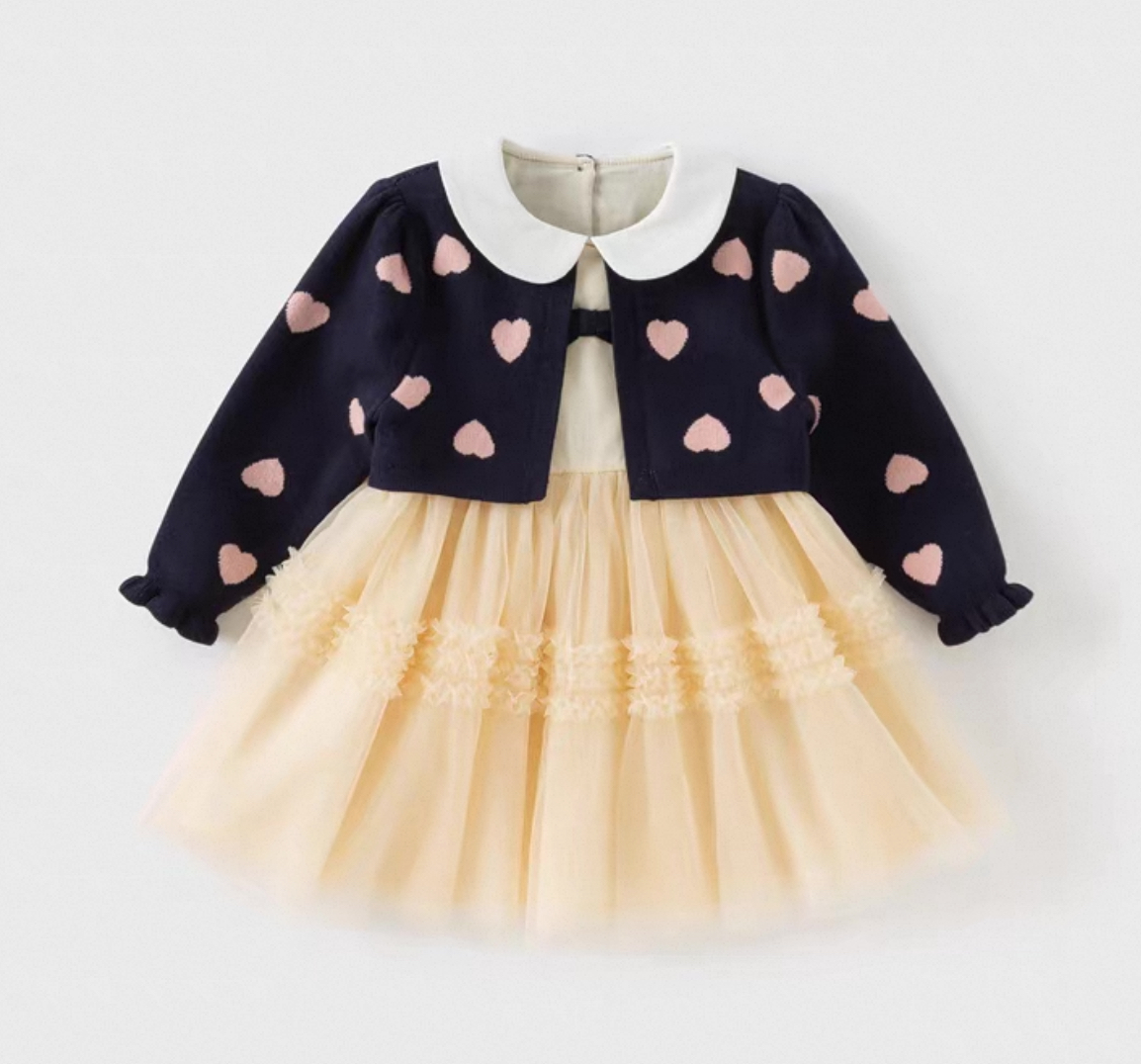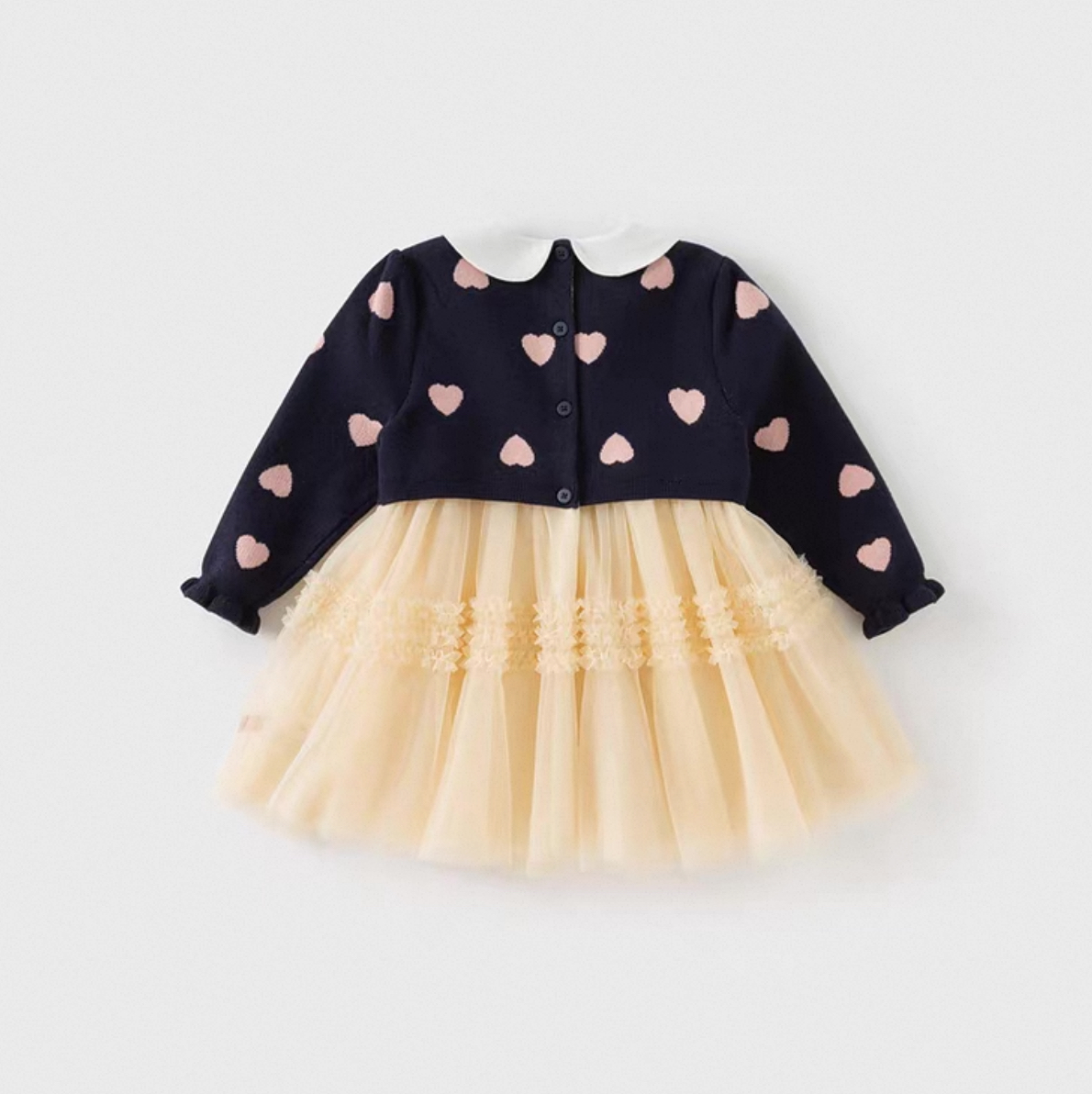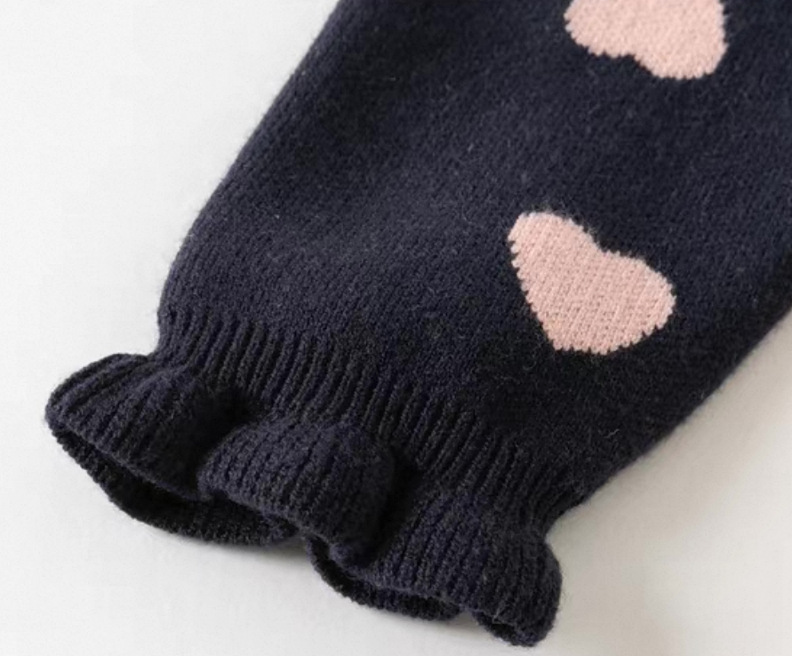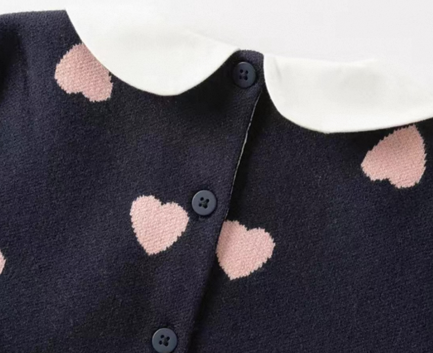 ドッキングされたネイビーのカーディガンには、ピンクのハート柄が全体にデザインされており、一気に可愛さアップ。