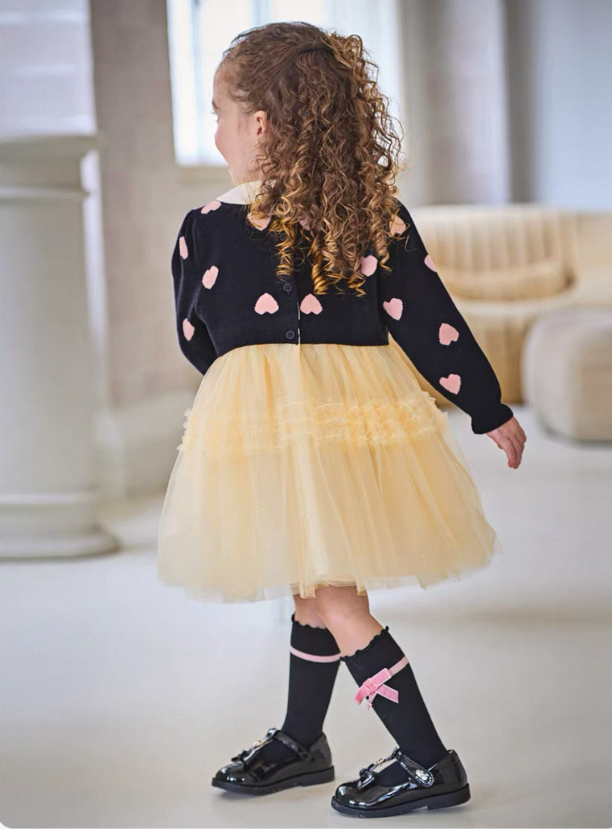 淡いイエローのチュールスカートがふんわり広がる、女の子らしさ満点のワンピースです。