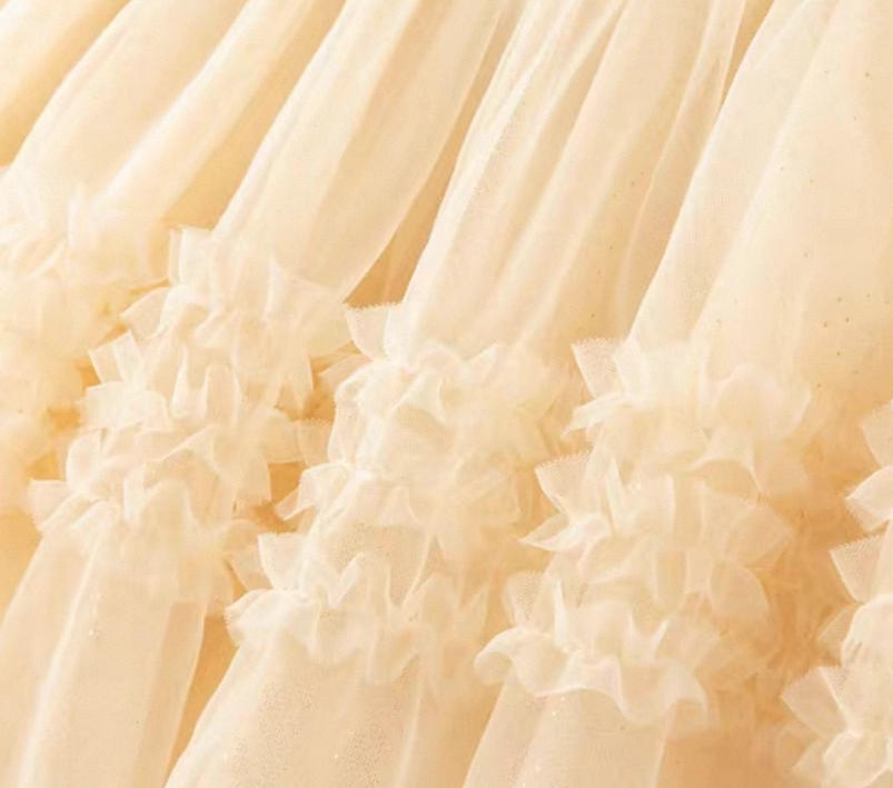 胸元から裾にかけて重なったチュールが華やかで、動くたびに軽やかに揺れます。