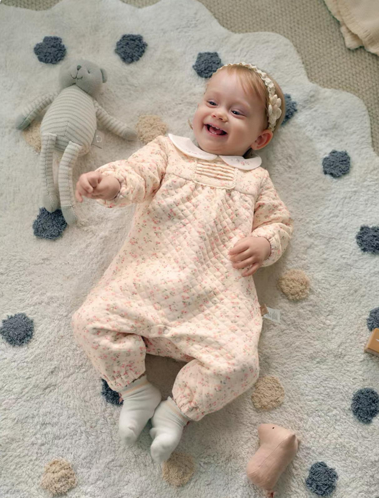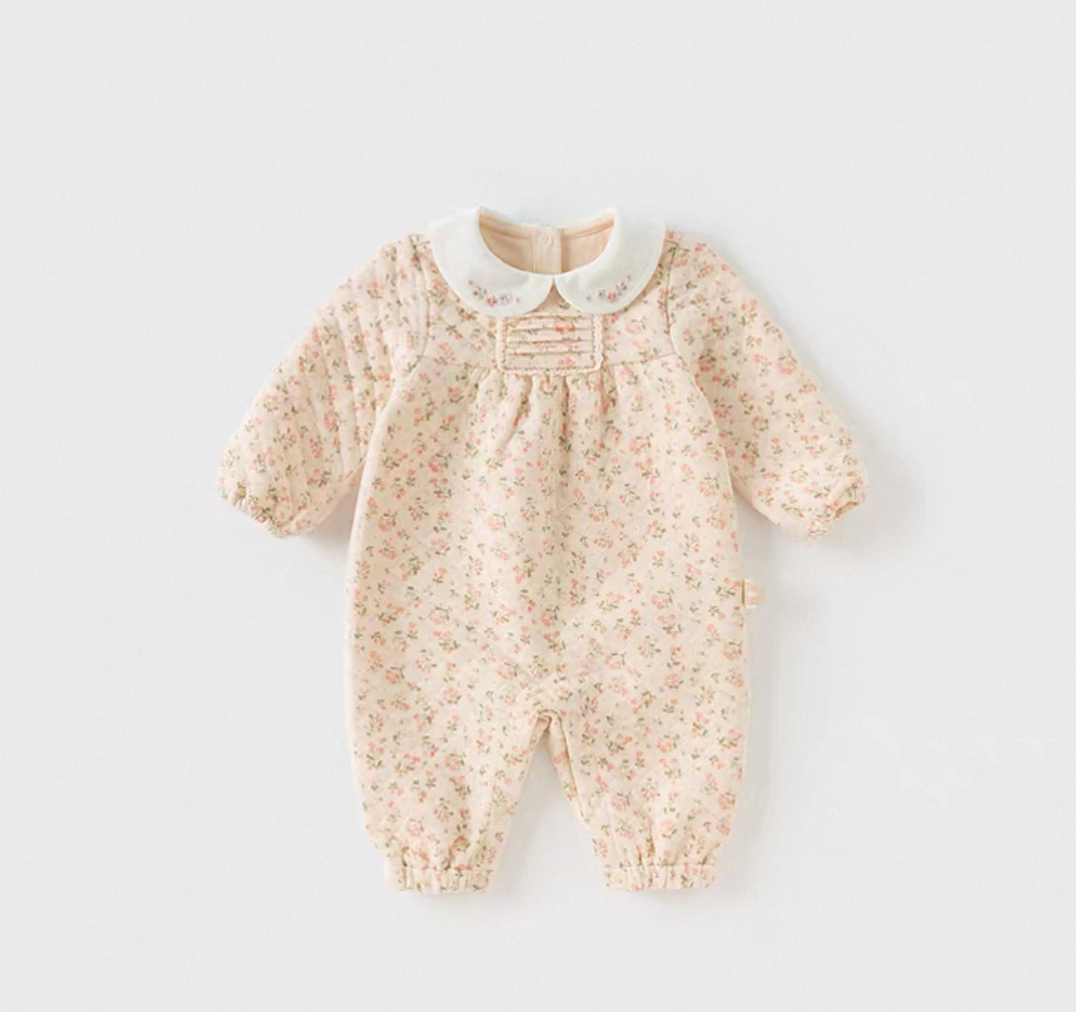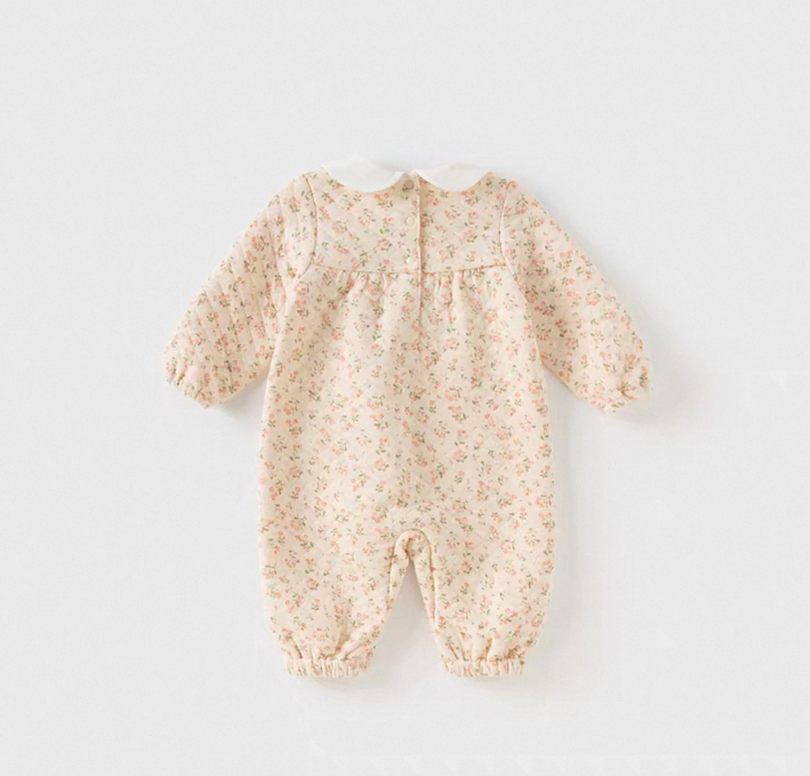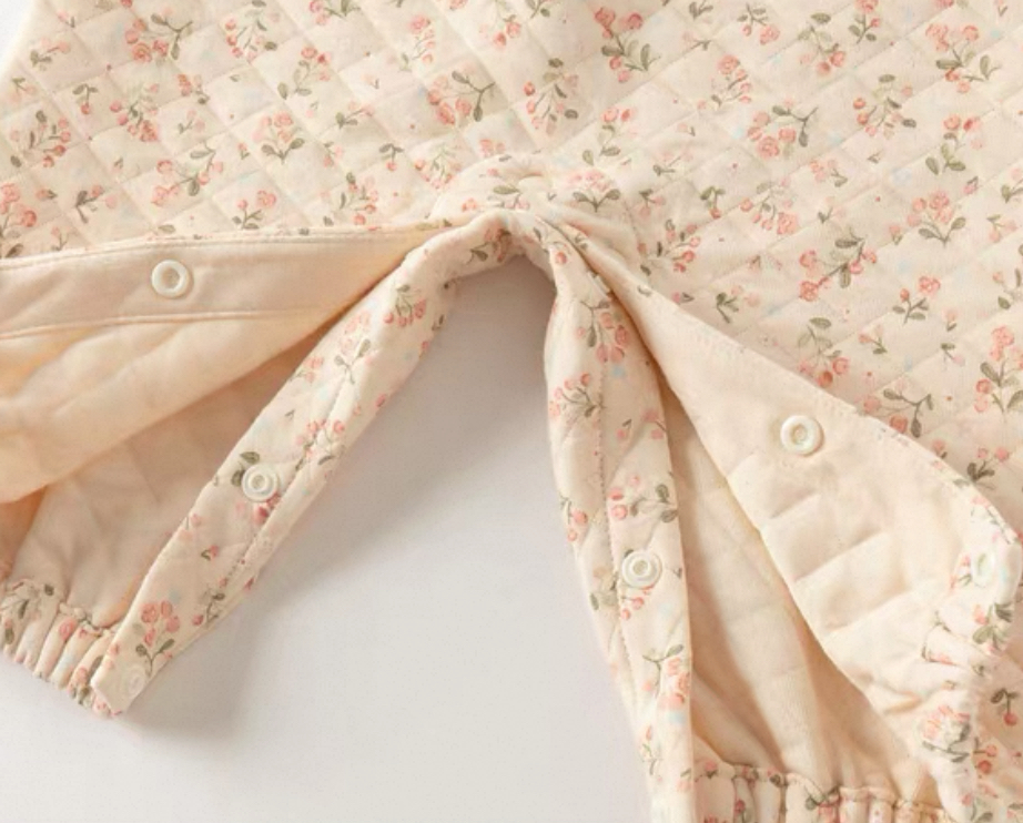 全体に散りばめられた小花柄がふんわりと愛らしいロンパースです。