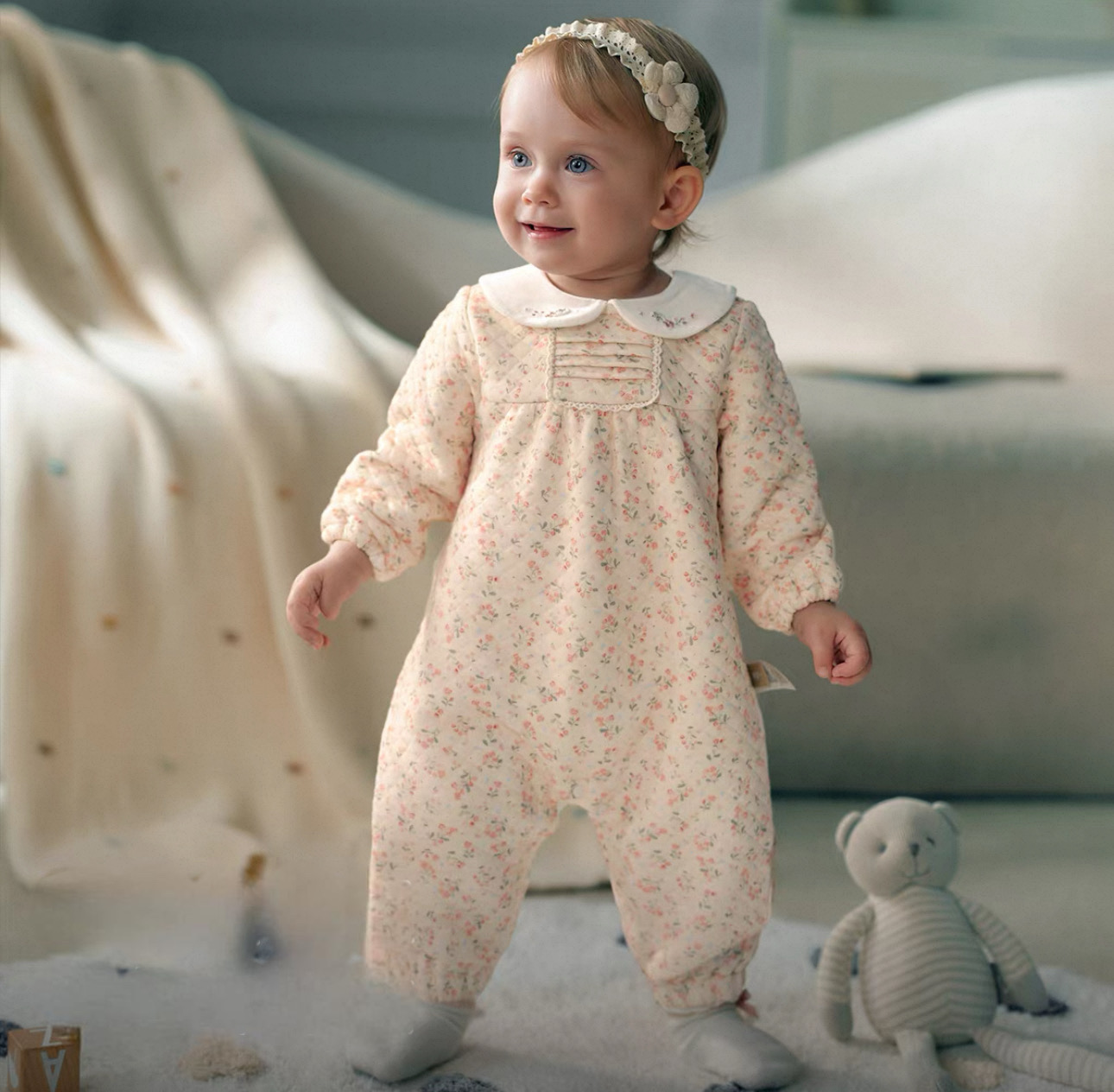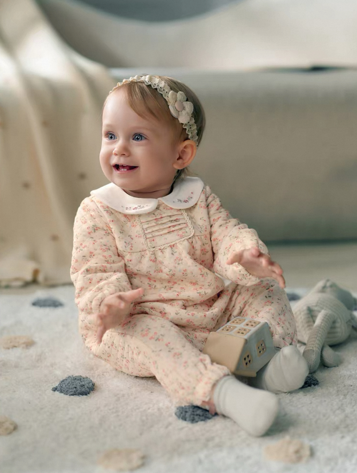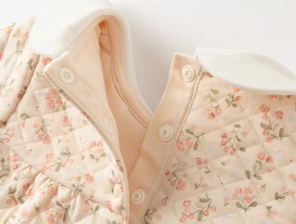 全体に散りばめられた小花柄がふんわりと愛らしいロンパースです。
