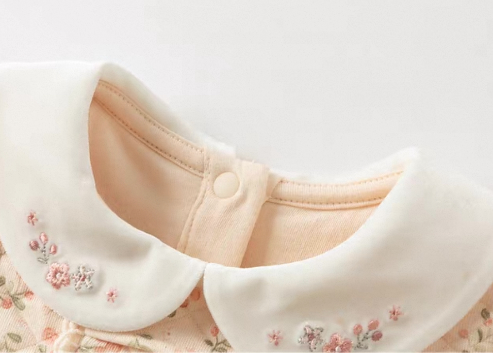 丸襟には小さなお花の刺繍があしらわれ、胸元にはタックとレースのディテールがプラスされておしゃれ感UP。