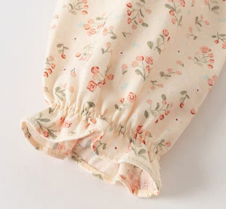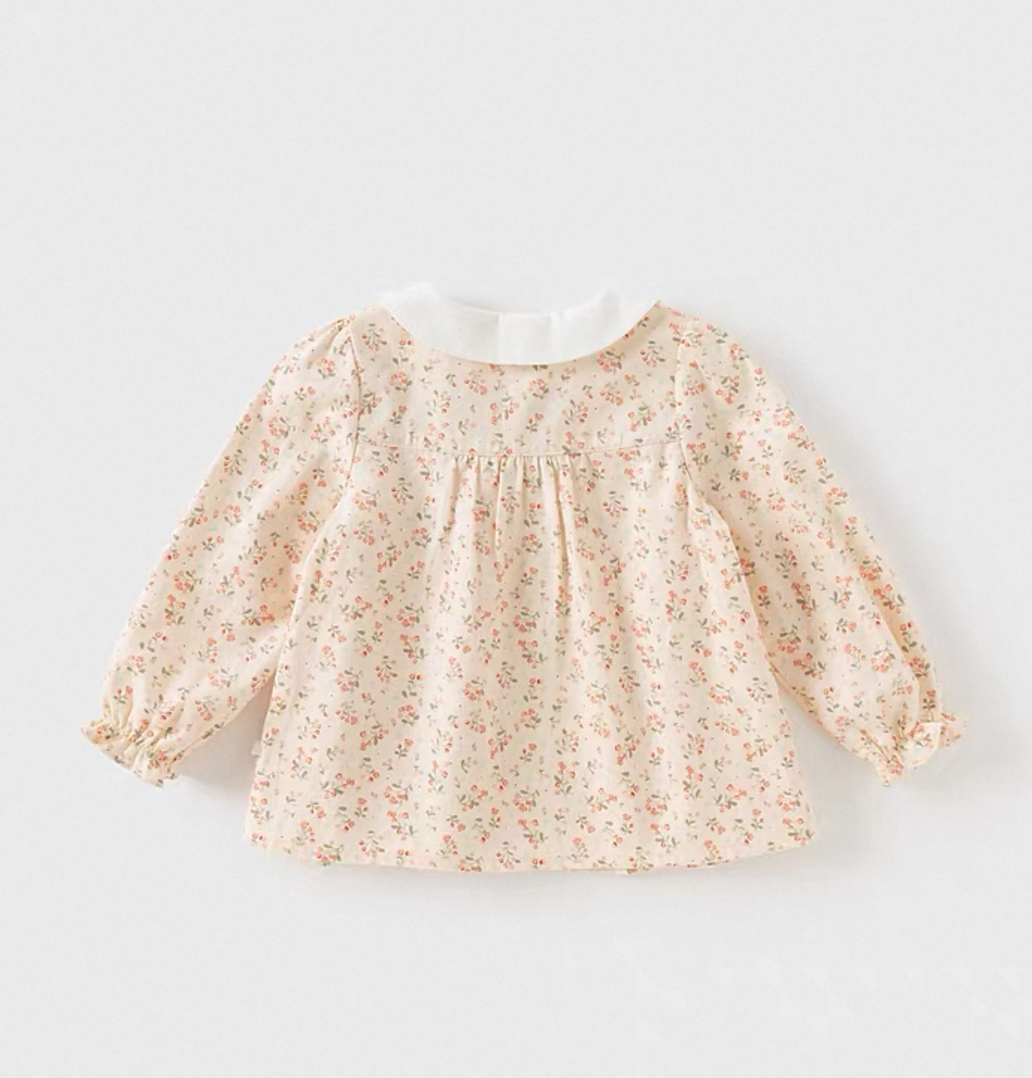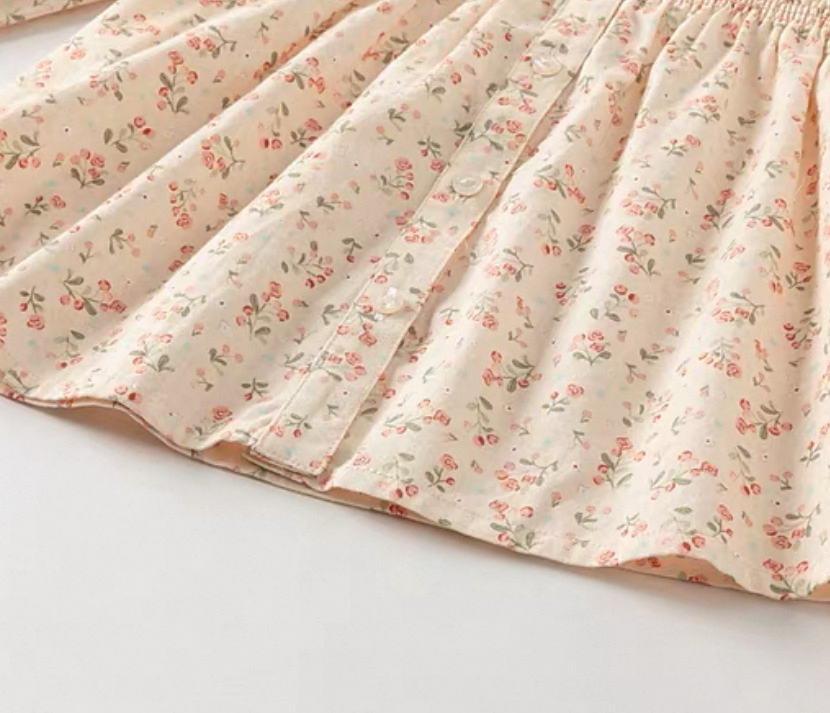 淡いベージュ地に散りばめられた小花柄が、女の子らしさを引き立てるロマンティックなトップスです。