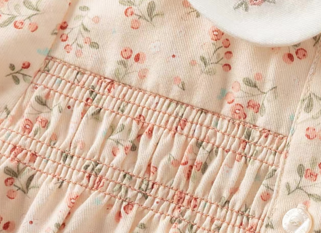 スモッキング風の細かいギャザーと飾りステッチが胸元を華やかに見せ、1枚で着ても写真映え抜群です。