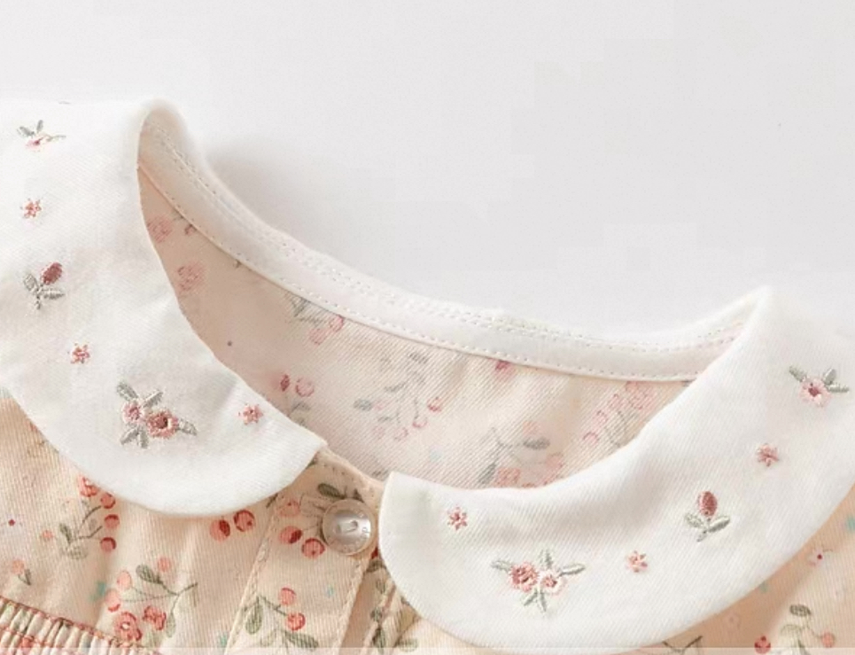 白い丸襟にはさりげなく小花刺繍をあしらい、やわらかい雰囲気と上品さをプラスしています。