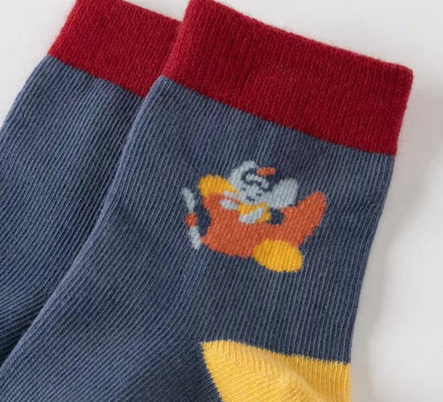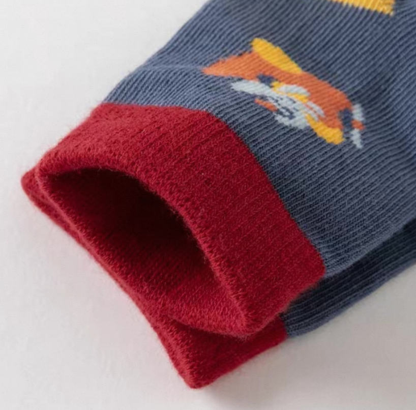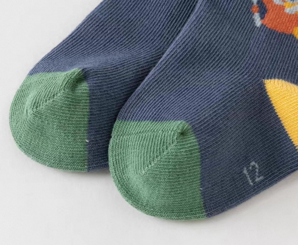 1足はクリーム×ブルーの柔らかな色味にキュートな恐竜柄、もう1足はネイビーをベースにカラーブロックと楽しいアニマル柄がデザインされています。