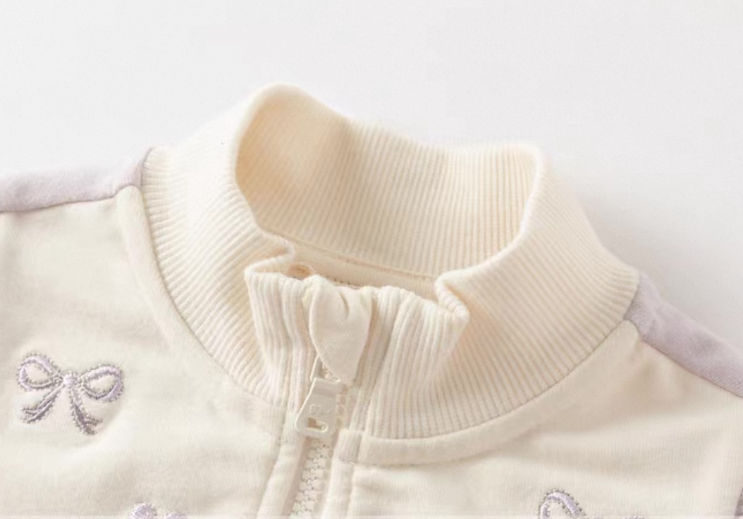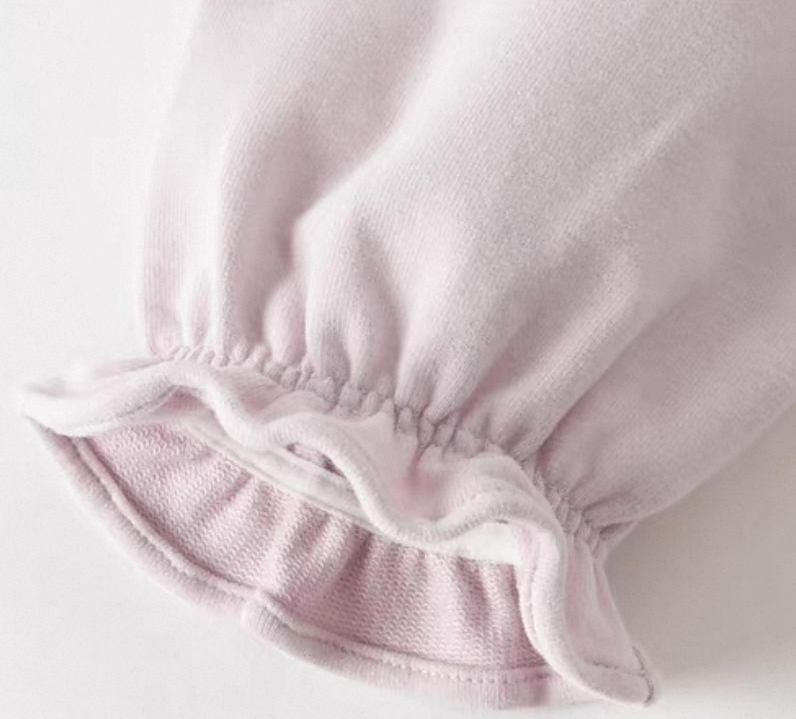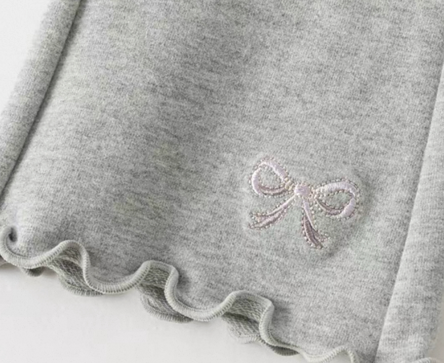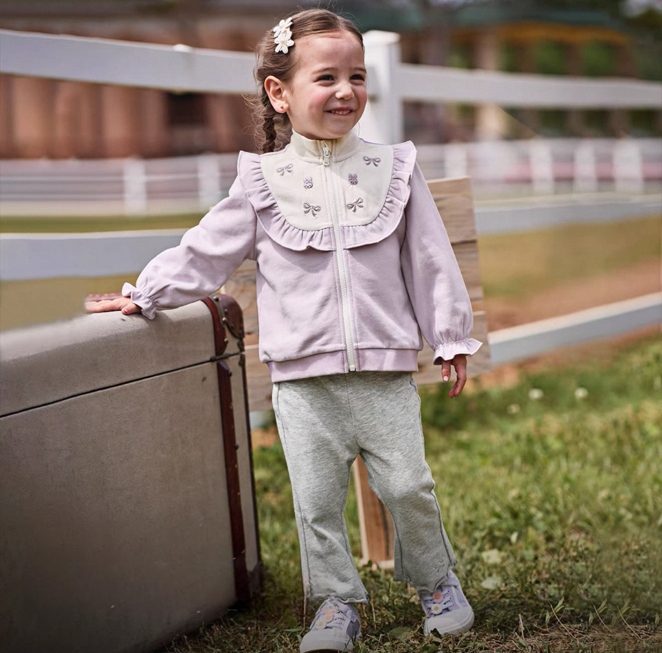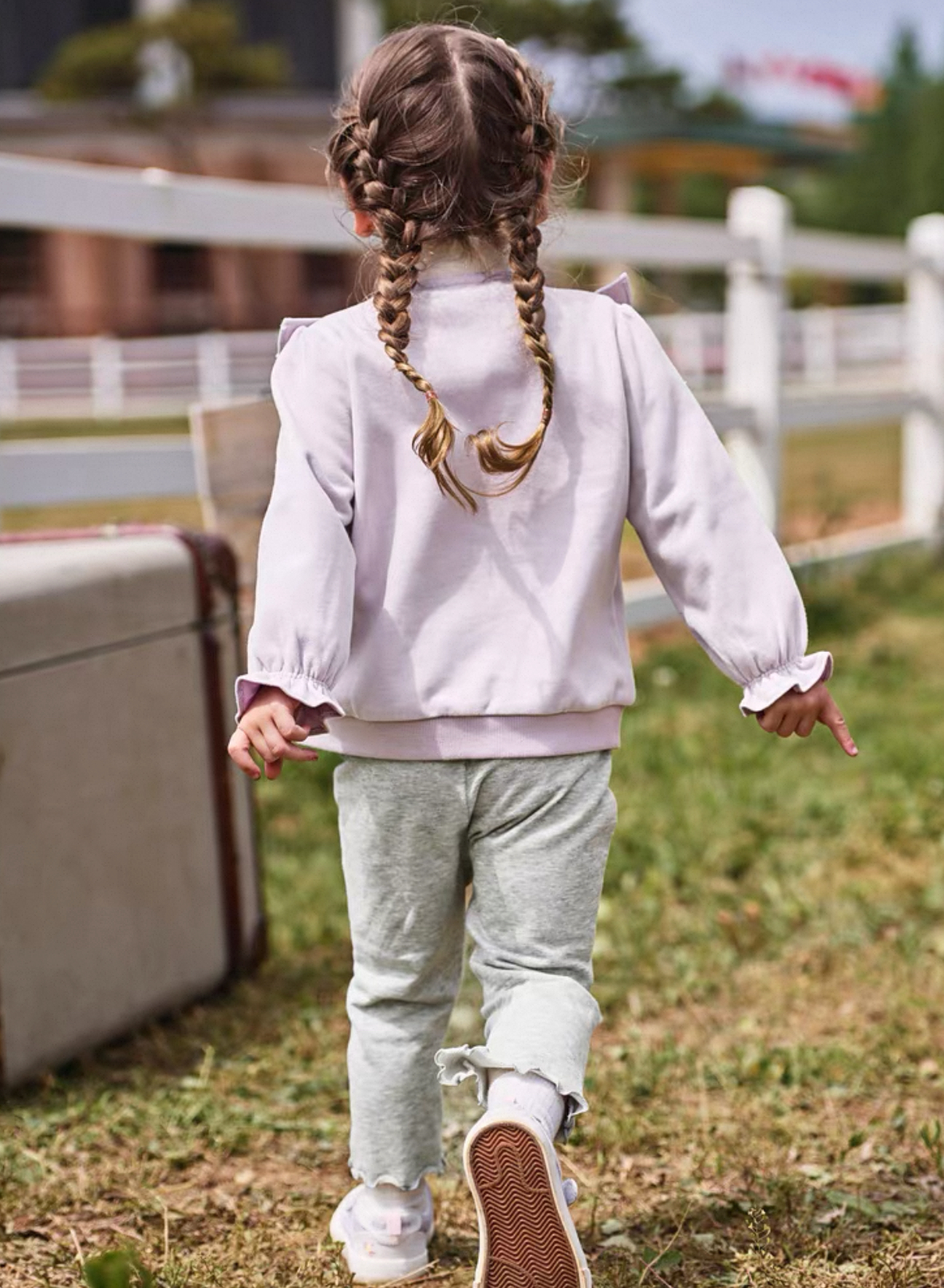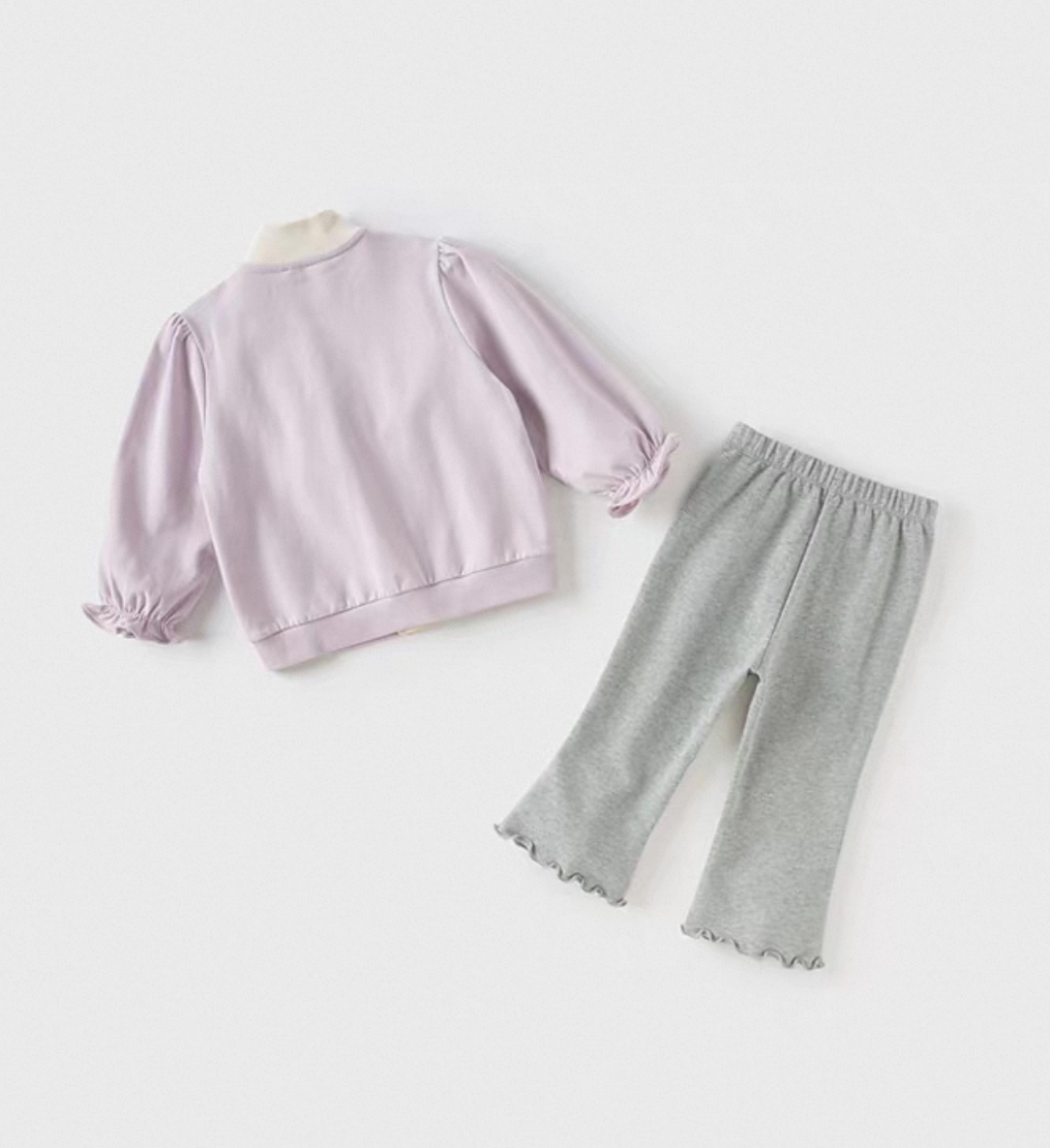 やさしいラベンダーカラーのトップスと、着回し抜群のグレーパンツがセットになった女の子向けセットアップです。