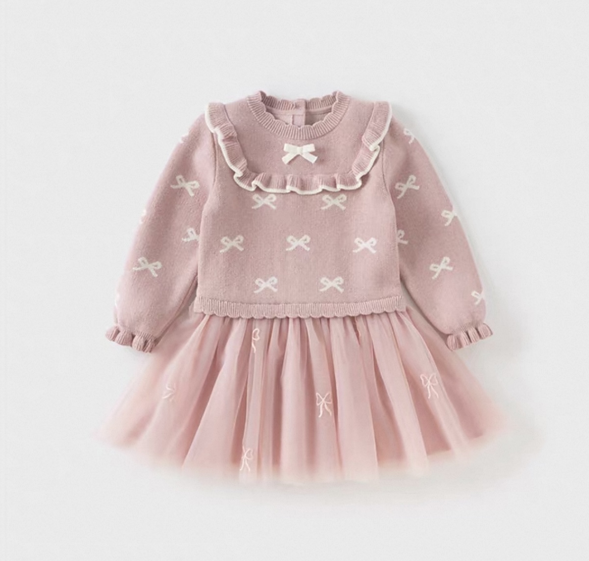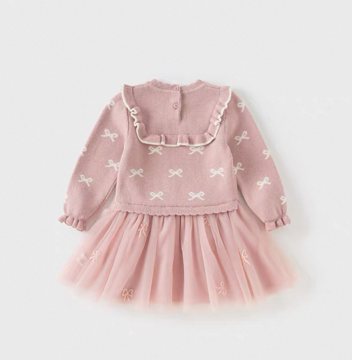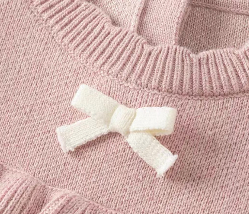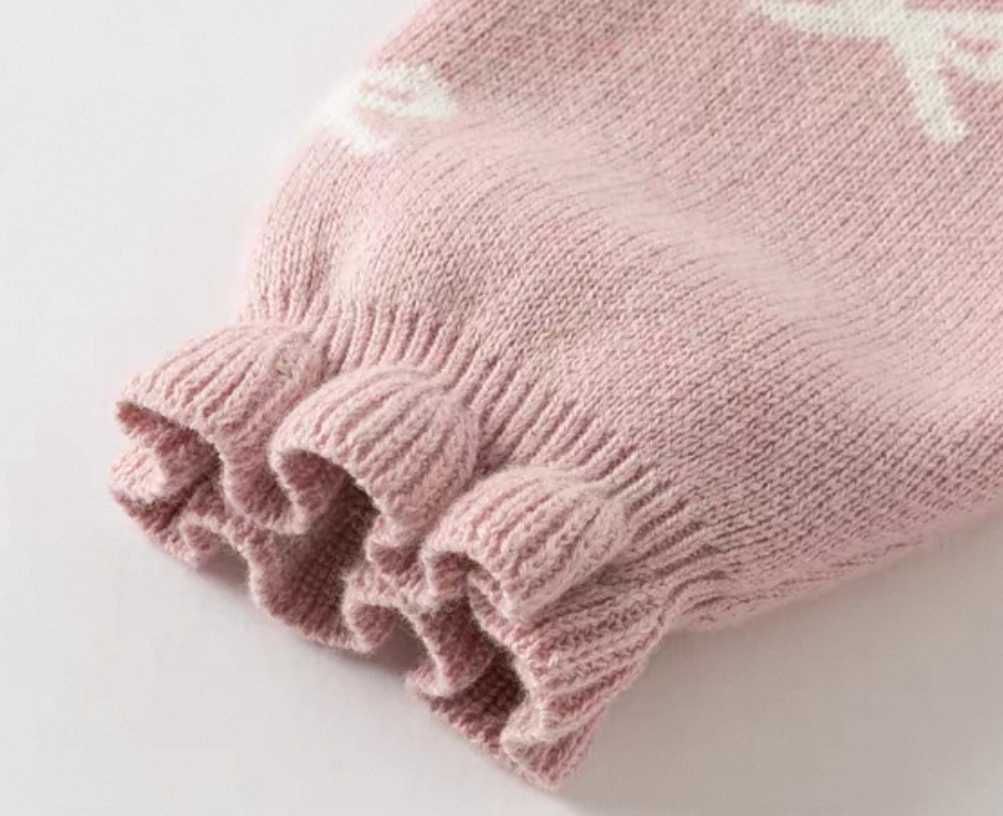 トップス部分は柔らかいニット素材で、全体に小さなリボン柄のジャカード編みをあしらった、とびきり可愛いデザインです。