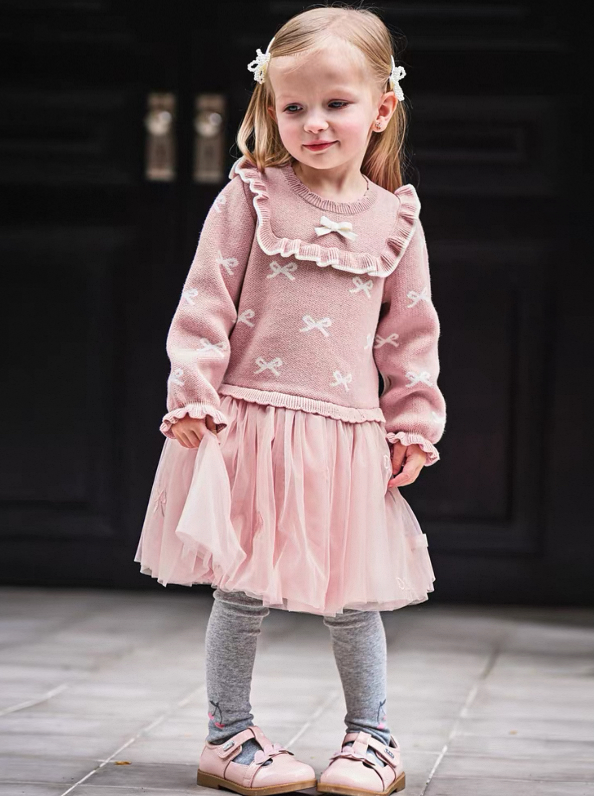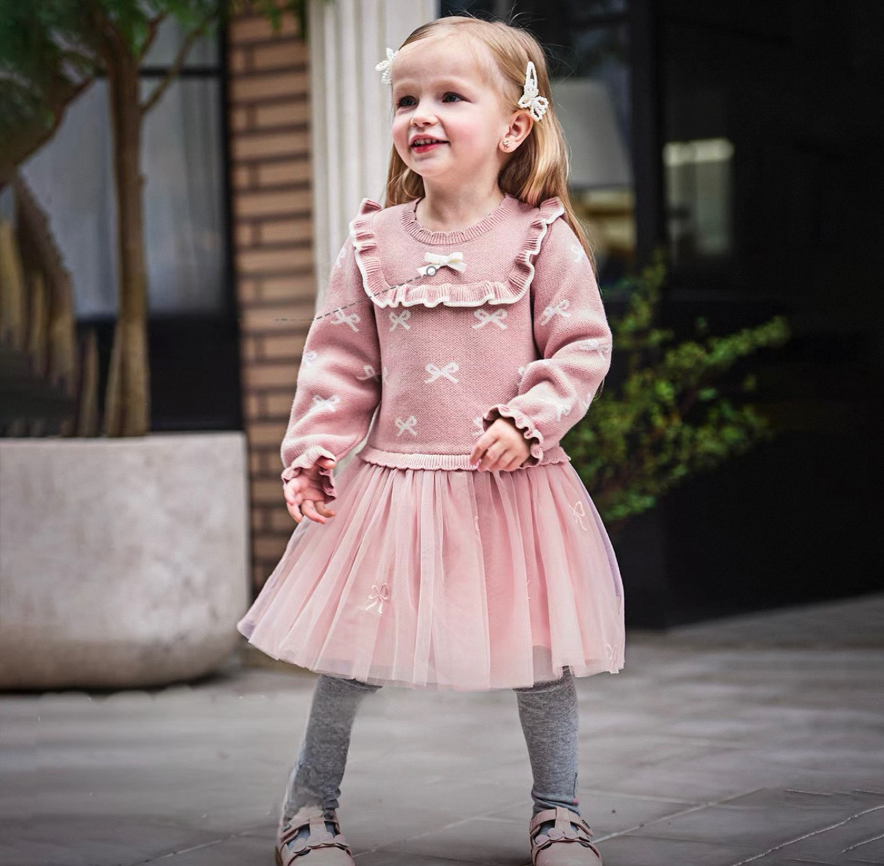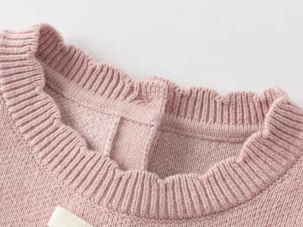 トップス部分は柔らかいニット素材で、全体に小さなリボン柄のジャカード編みをあしらった、とびきり可愛いデザインです。