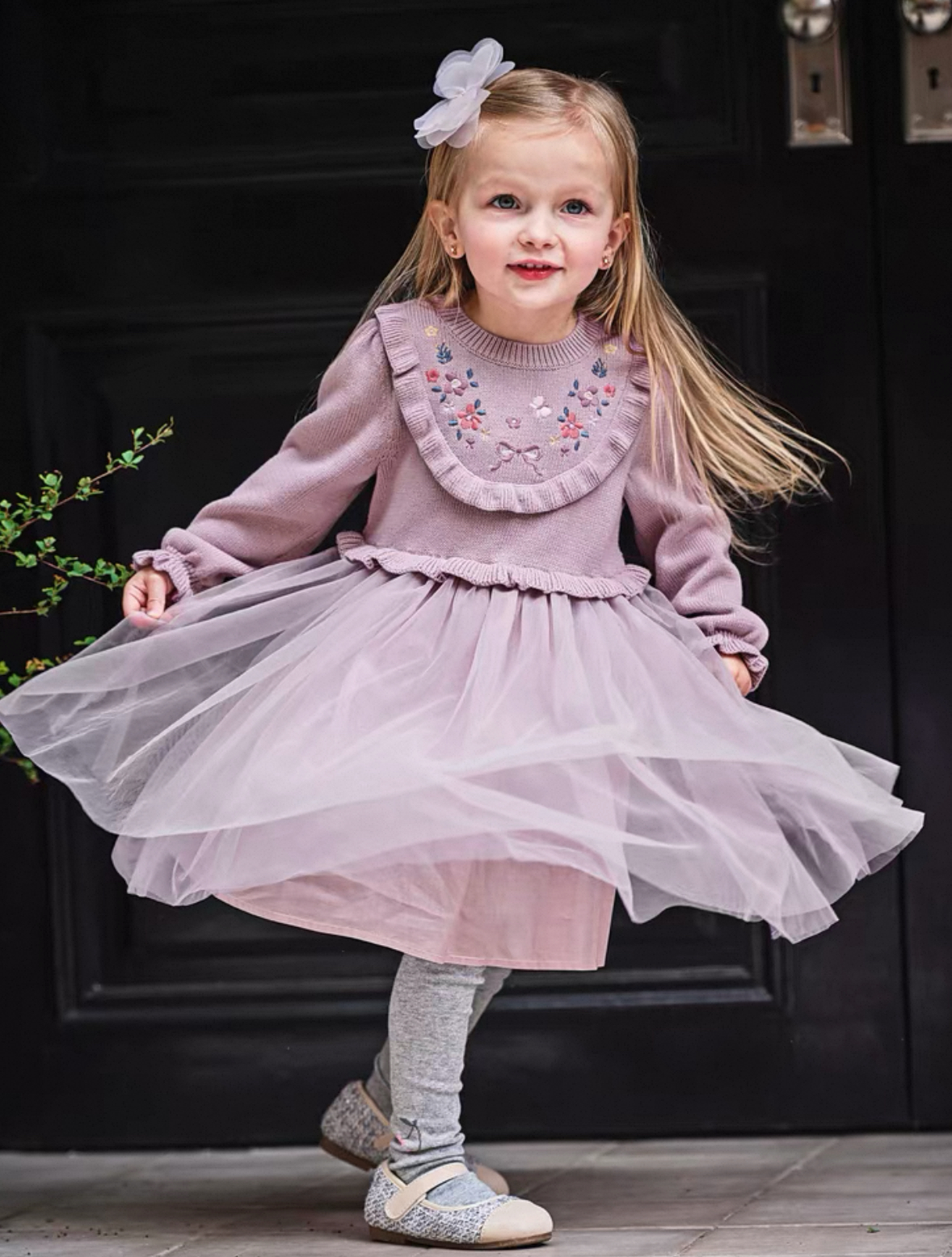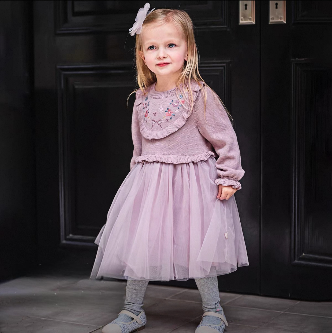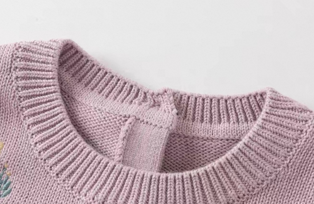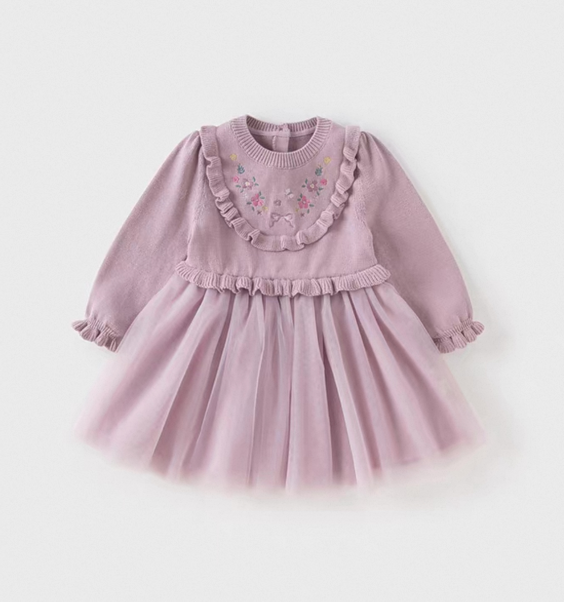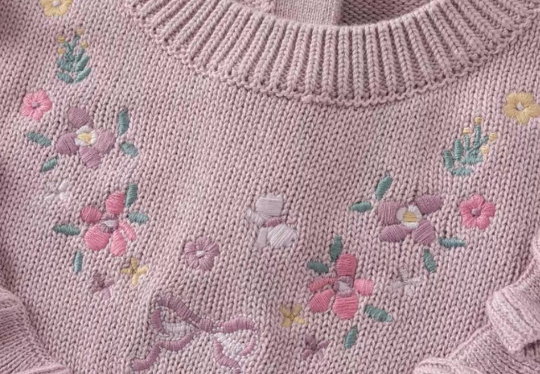 トップス部分は柔らかいニット素材で、胸元には小花刺繍とリボン刺繍があしらわれた華やかなデザインです。