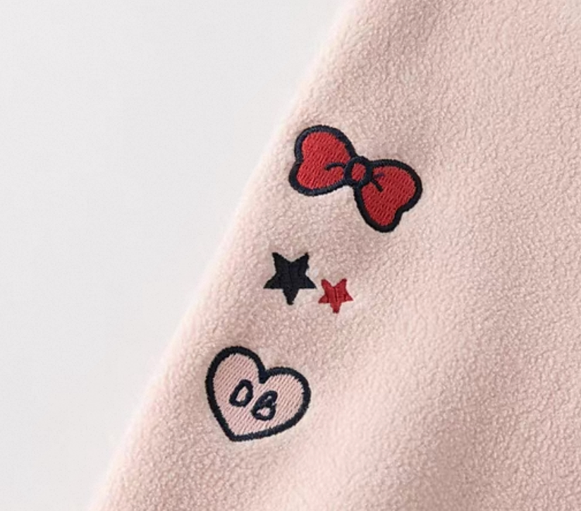 胸元と袖には、リボンやハートの刺繍モチーフが施されており、