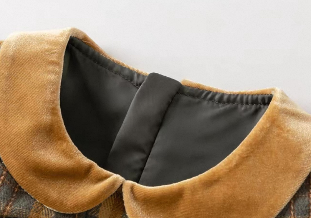 丸みのあるベロア調の襟が上品で、肩には小さなフリルをあしらったガーリーなディテールに。