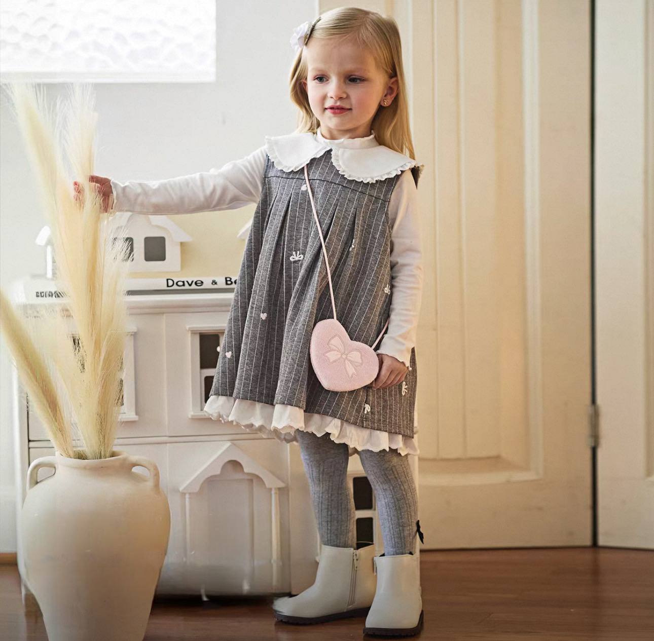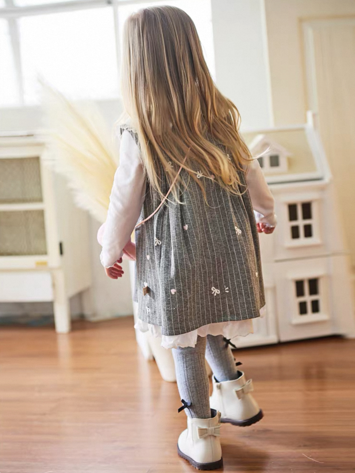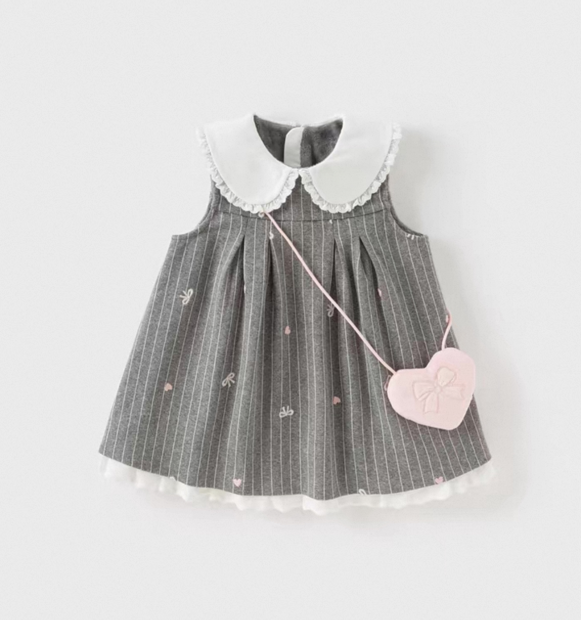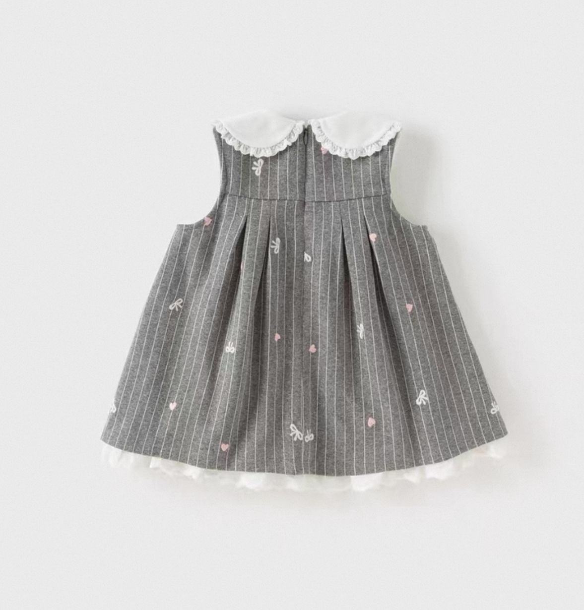 細かなストライプに、リボンやハートの刺繍が散りばめられたガーリーなワンピースです。