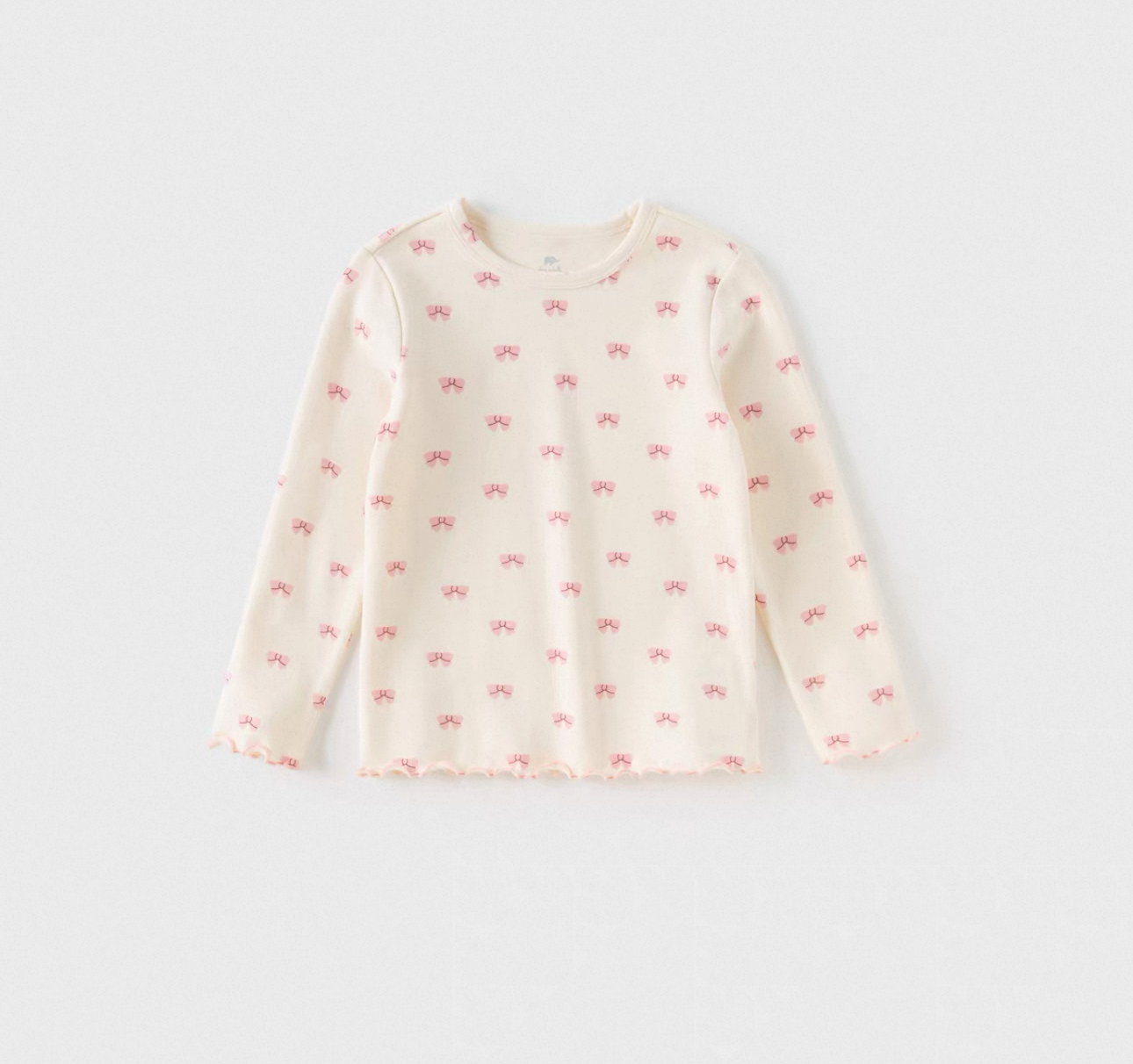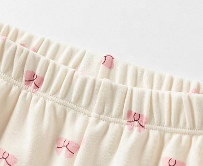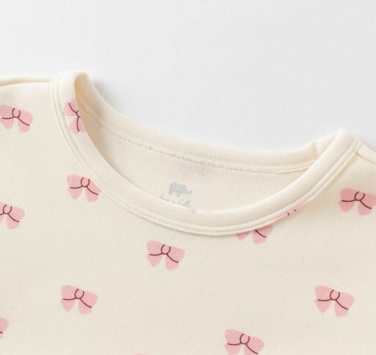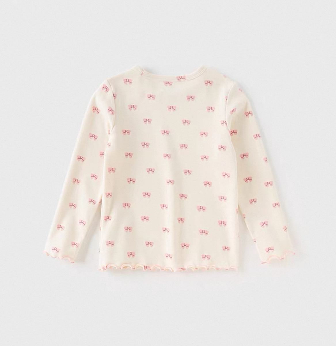 全体に散りばめられた小さなピンクのリボン柄が愛らしいパジャマセットです。