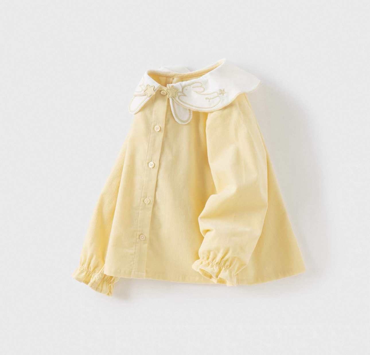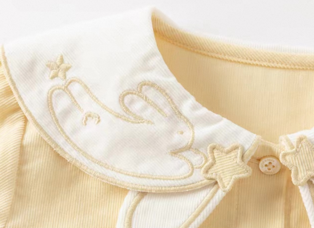 存在感のある大きめの丸襟には、お花や星の刺繍があしらわれ、顔まわりを華やかにしてくれます。
