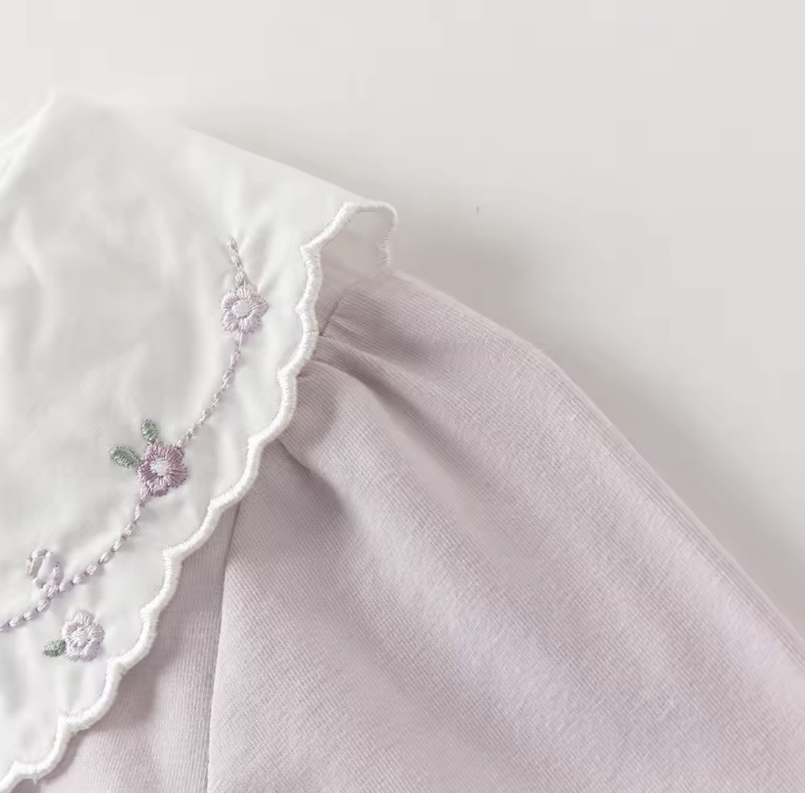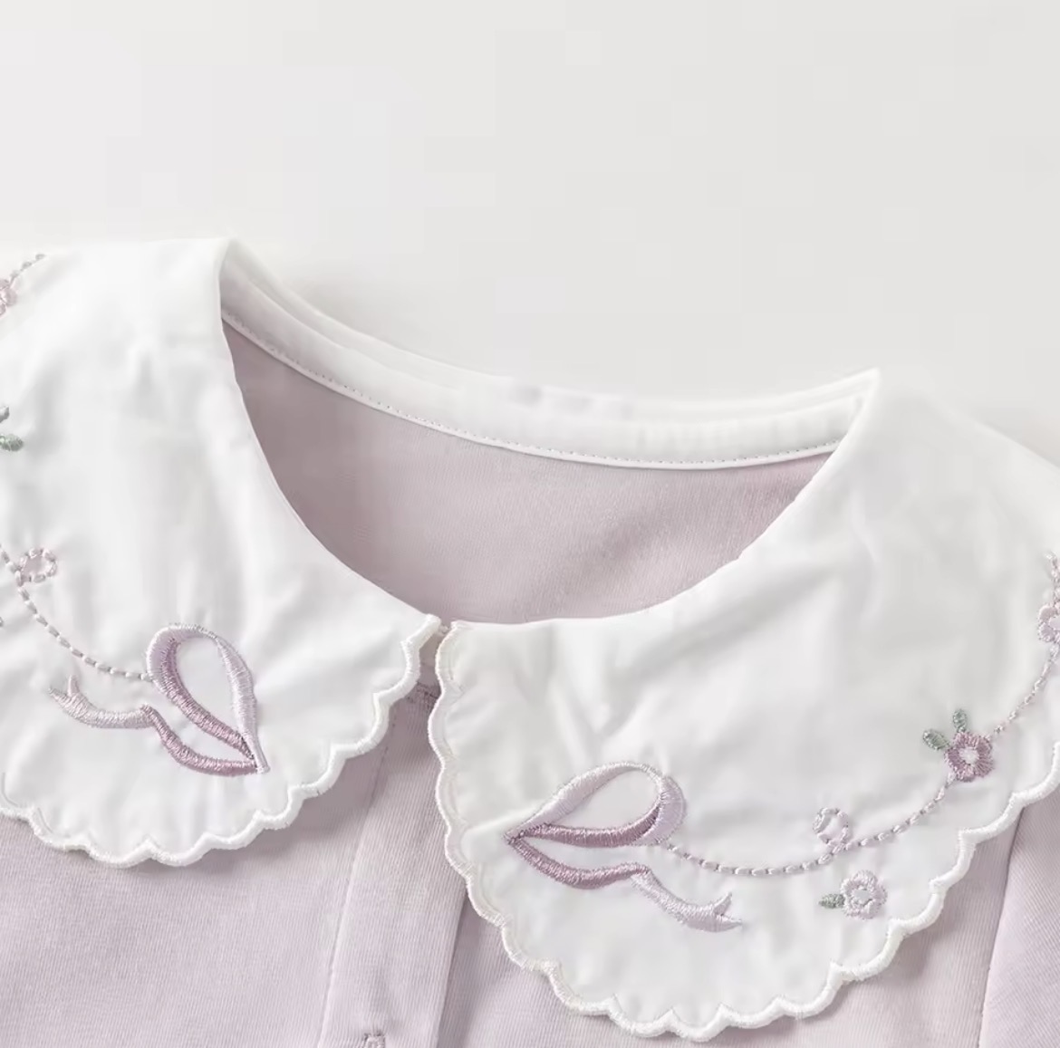 スカラップ仕上げの丸襟には、