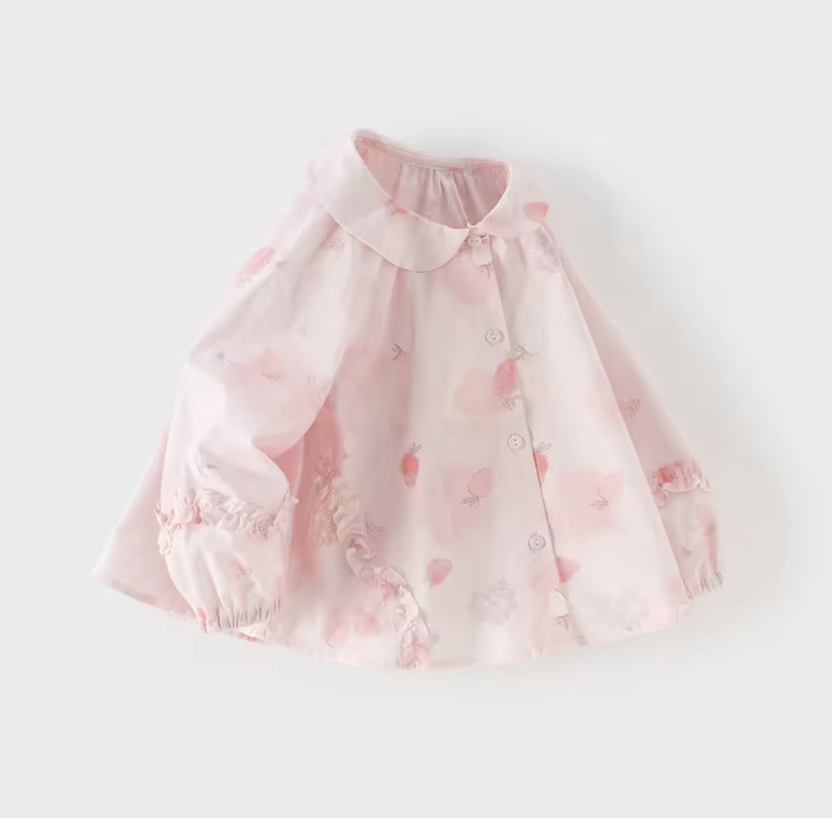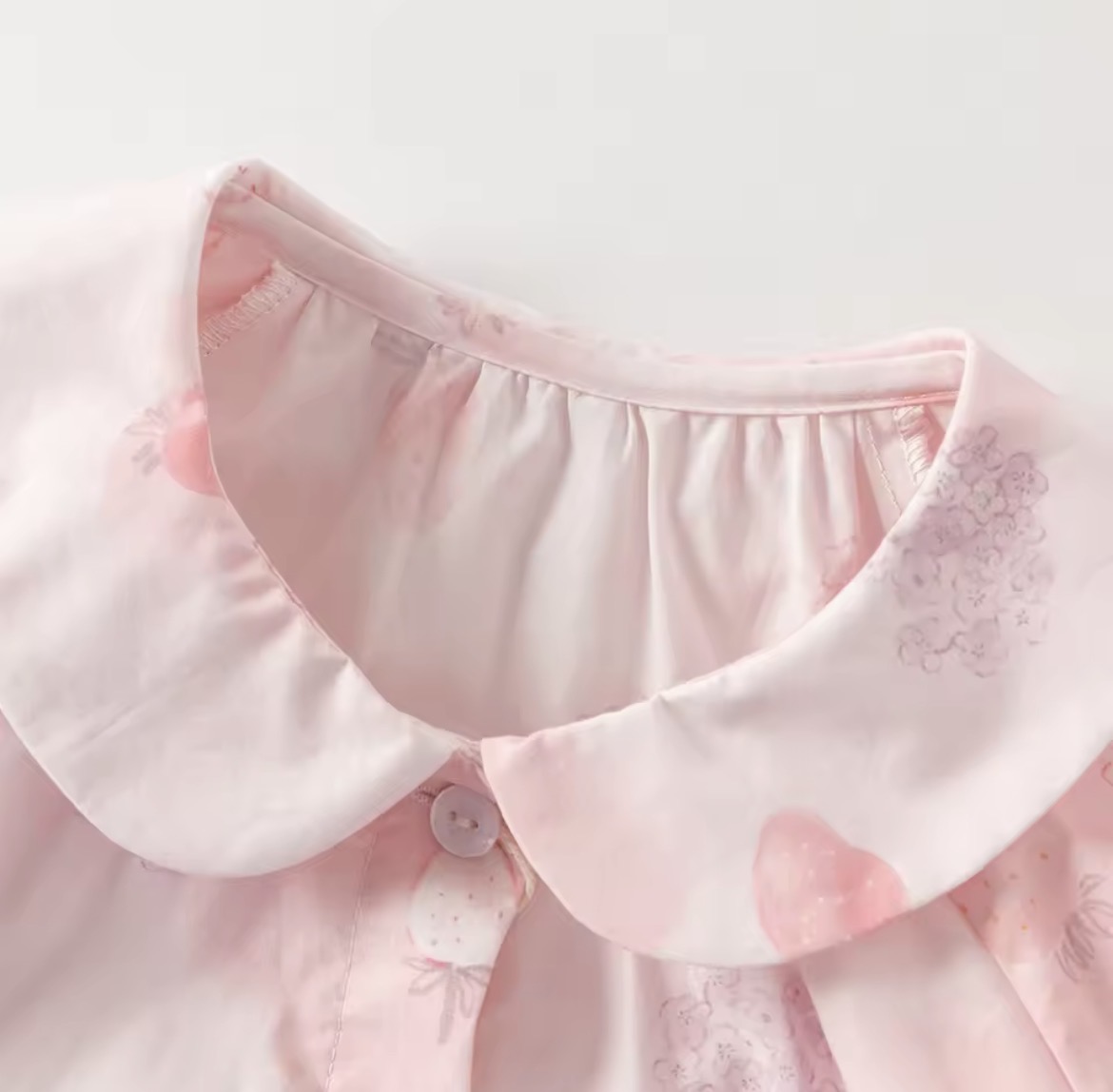 丸みのある襟や、袖口のフリルが